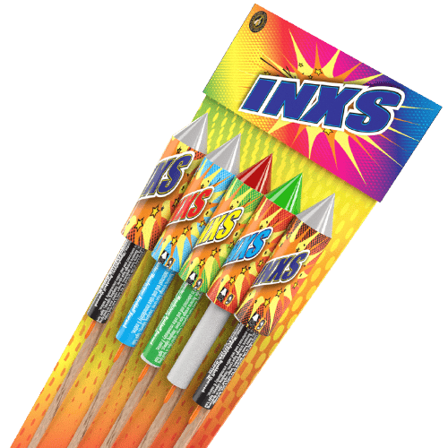 The INXS Rocket 5 Pack is a great value small garden display pack. With an assortment of five different rocket effects. Including the following, red crackling. And red, green and silver blink. Also green crackling. Next in line comes blue crackling. Then not forgetting the silver blink with green and red. This great small category 2 rocket pack. Makes it ideal for any garden display. And comes with a recommended minimum safety distance of at least 8 metres. While each pack of rockets comes with a firing tube. To help you launch INXS Rocket 5 Pack skyward.