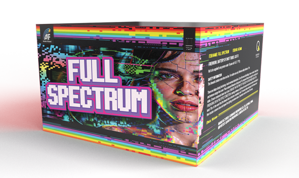 Full Spectrum is a Category F3 firework. Maintain a minimum safety distance of 25 metres and ensure the product is placed on a flat, stable surface before ignition.