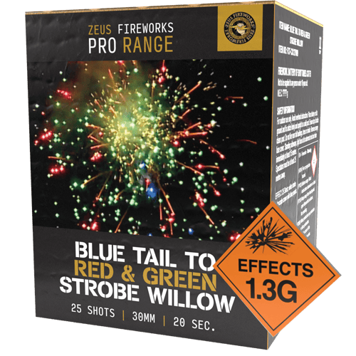 We are delighted with the addition. Of our Pro Range - Blue Tail To Blue & Green Mine. To our professional range of fireworks. While our professional range offers excellent quality. With reverberating sound and vision. As soon as the blue tails head skyward. Your spectators will be captivated, Then stunned at the explosion of red and green strobing effects. Although having a duration of 20 seconds. This pacey and noisy quality category 2 firework. Meanwhile, reaches a noisy 9 out of 10 sound level. Meanwhile, why not take a look at all our Pro Range barrages. Including our low noise range. for some stunning effects. And vibrant colours. For example our Pro Range White Strobe to Brocade Crown with Blue