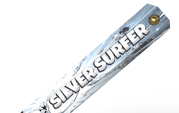 Silver Surfer is a 56 shot Roman candle delivering approximately 25 seconds of bright silver star tail effects. Each shot fires in a steady rhythm, producing clean bursts with trailing silver sparks.