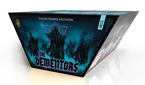 The Dementors is a 100 shot firework cake delivering approximately 50 seconds of bold and varied aerial effects. The display opens with brocade crowns enhanced by pink and blue stars, followed by impressive titanium gold palms combined with white, gold and green strobe.